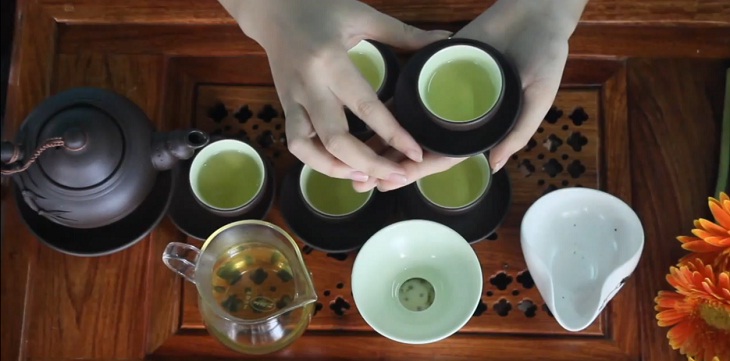 - Khi rót nước trà trong trường hợp pha trà đãi khách, hay pha cho nhiều người uống, việc rót nước trà mời khách cũng cần phải có nghệ thuật, người dân xứ chè rất để ý đến vấn đề này, nó cũng được xem là một thói quen khi uống trà. Ghé miệng vòi ấm sát vào chén vừa rót vừa nâng từ từ ấm lên cao, rót ít một lần lượt các chén rồi rót vòng lại khoảng 2 đến 3 lần cho đến khi đầy chén. Việc rót nước trà chén như vậy đảm bảo nước trà trong chén đều nhau không bị chén đậm chén nhạt.